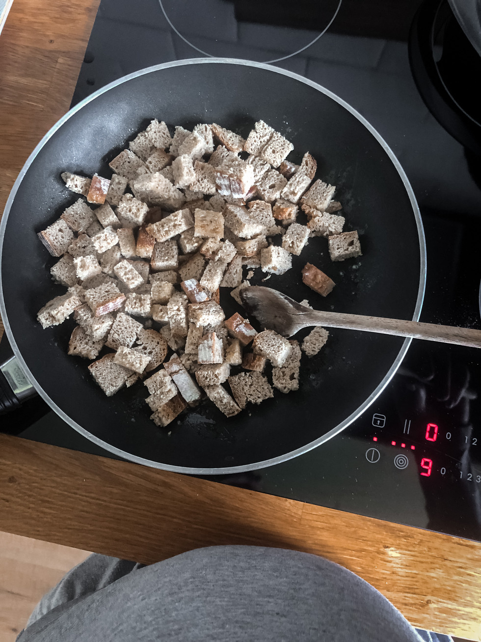 5. Schlagobers und Milch zugeben und 5 Min./95°C/Stufe 2 kochen. Währenddessen 30-60 g Butter in einer Pfanne auf dem Herd erhitzen und die Brotwürfel darin knusprig anrösten. Petersilie zugeben und Brotwürfel in eine Schüssel umfüllen.